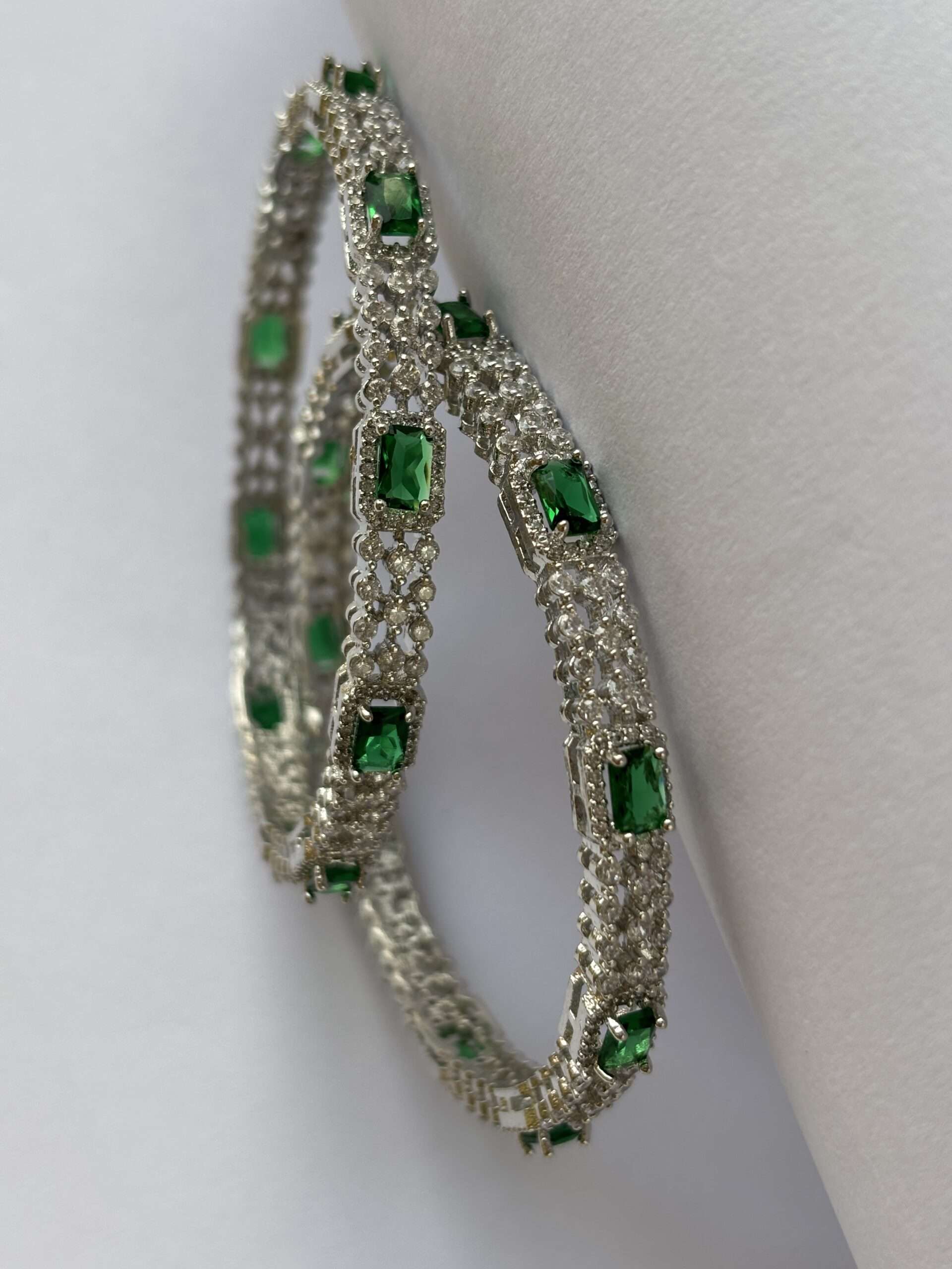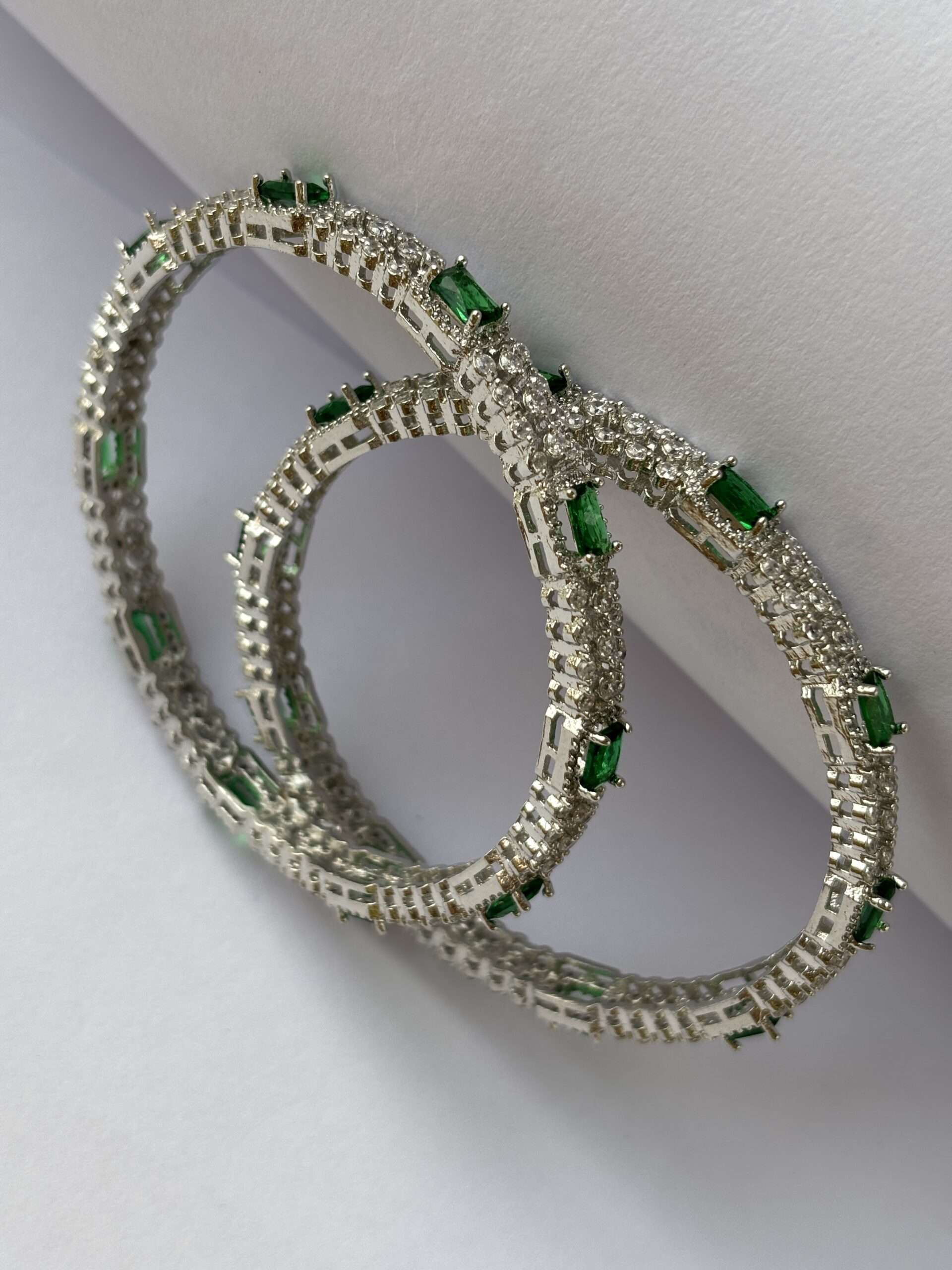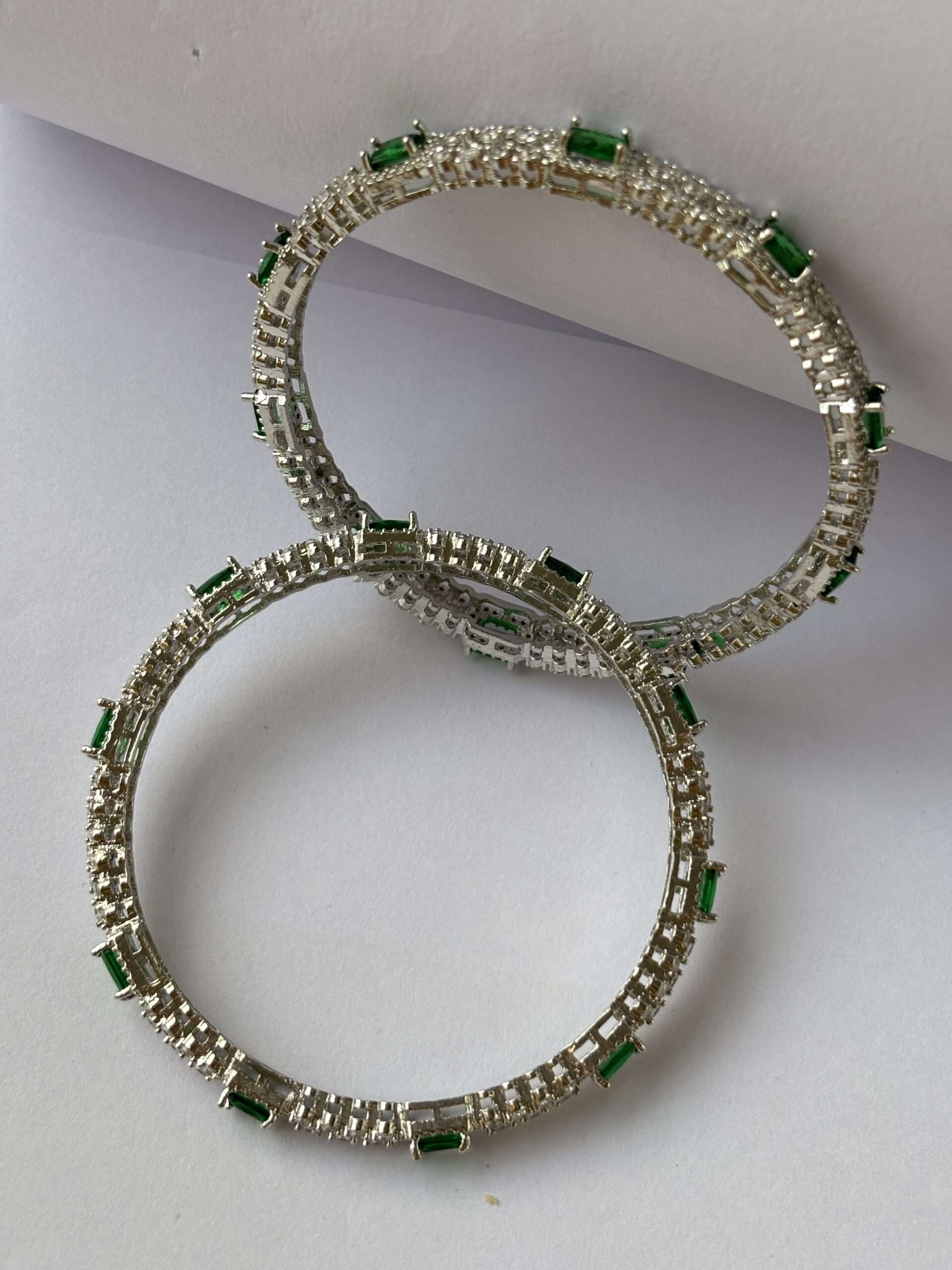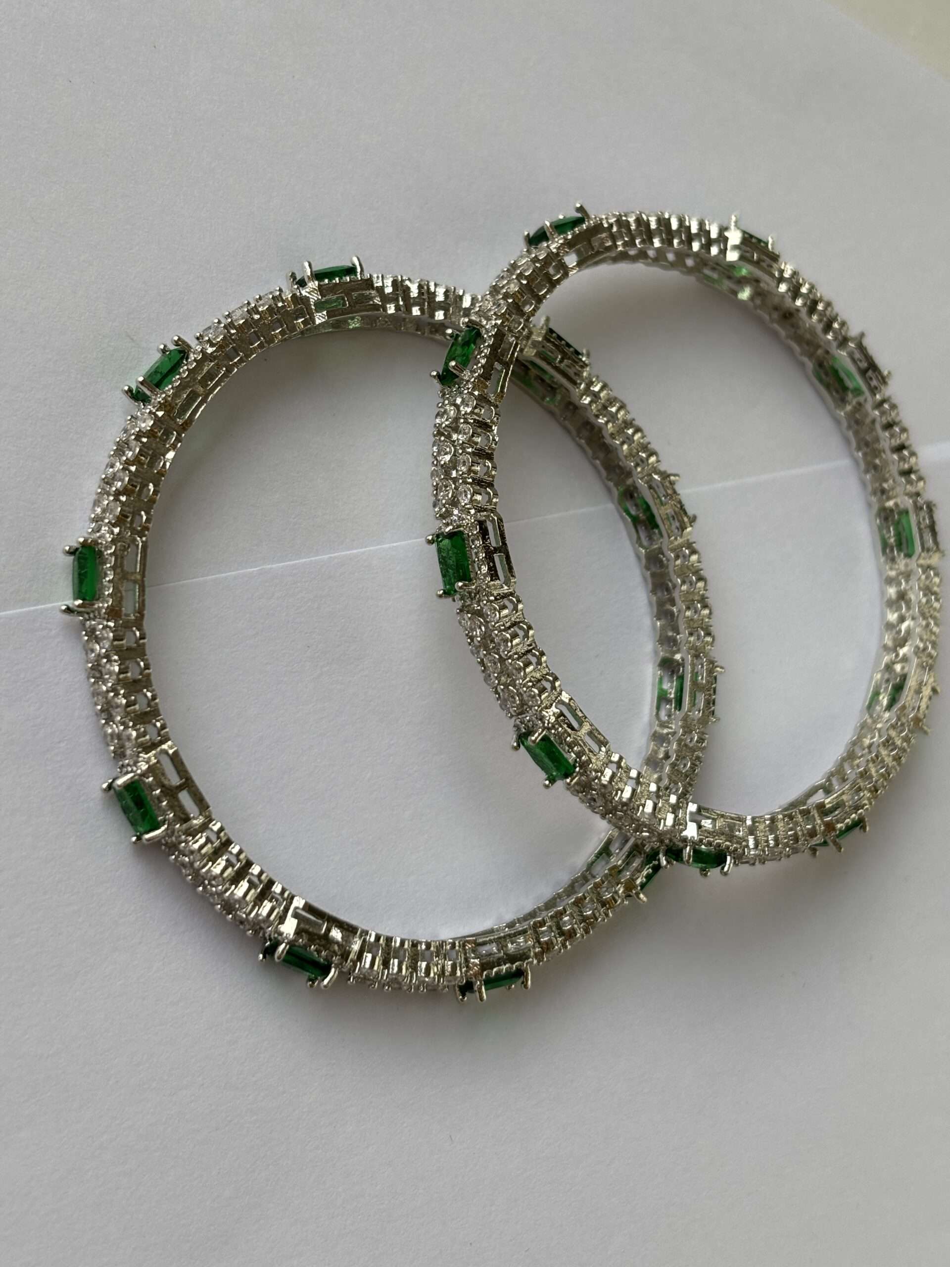 - Material: High-quality metal alloy with rhodium plating for a platinum-like shine and durability. Stones: Adorned with emerald green and white American diamonds (CZ stones) for a sparkling, diamond-like brilliance. Set of 2 Bangles: Comes as a pair of matching bangles, perfect for a balanced, elegant look. Design: Modern and sophisticated design featuring vivid emerald green accents with brilliant white stones. Comfortable Fit: Lightweight and skin-friendly, designed for all-day comfort. Durability: Rhodium-plated finish provides anti-tarnish protection and maintains a long-lasting shine.